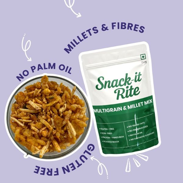 MULTIGRAIN & MILLET MIX – JOWAR MURMURA, ROASTED CORN FLAKES, ROASTED POTATO STICKS, ROASTED CHANA DAL, ROASTED BESAN (GRAM FLOUR) SEV, CORN BALLS, SALT, CUMIN, CORINADER POWDER, JAGGERY, SESAME, FENNEL SEEDS, TURMERIC, MANGO POWDER, CHILLI POWDER, RICE BRAN OIL
