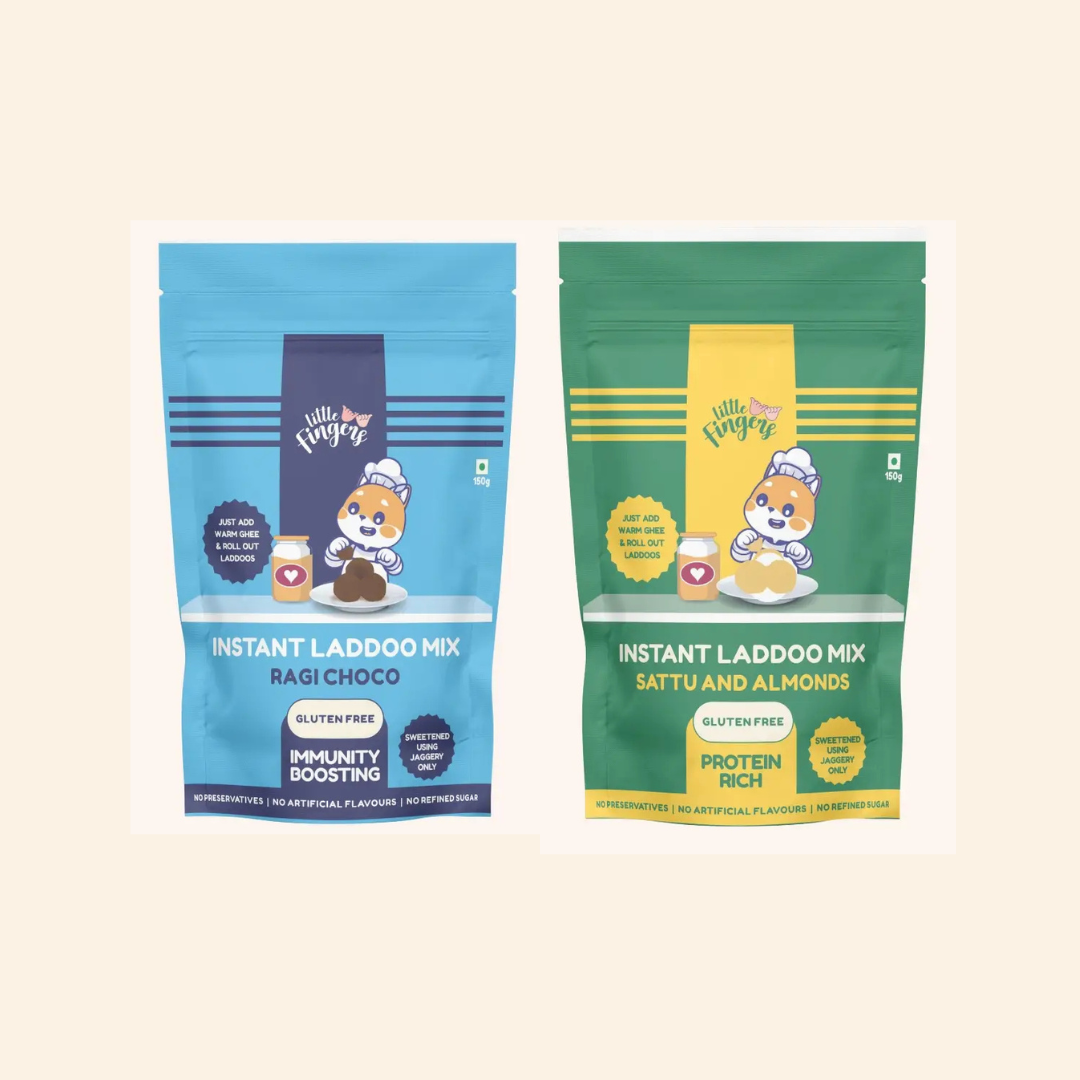 Enjoy this Combo of 2 best gluten free flavours of Laddoo premixes. This combo ensures two different flavours of guilt-free laddoo, made in less than a minute, for your little one’s sweet craving! What makes our laddoos special – The fact they are enriched with millets, dryfruits and nuts