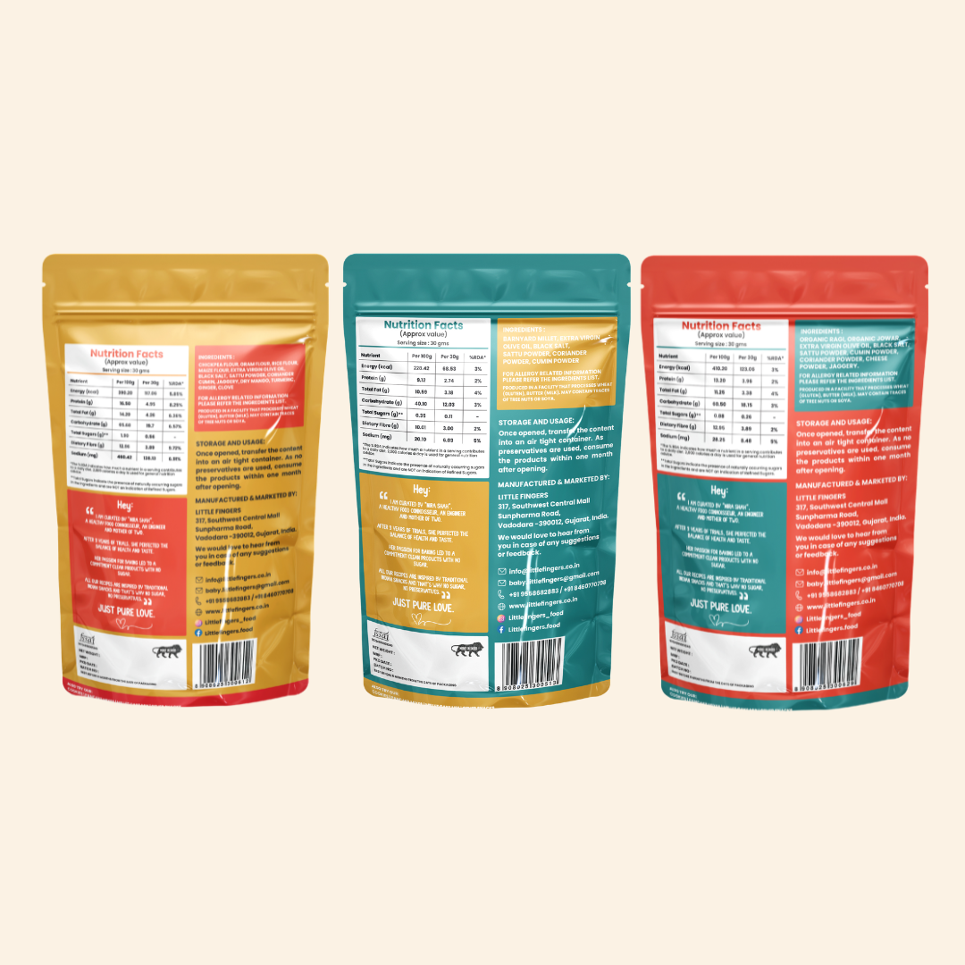 Enjoy and savour our three non-spicy snacks combo for your little one! Healthy, nutritious and protein packed snack made by roasting chickpea sticks in extra virgin olive oil. The chickpea sticks are seasoned using traditional indian masalas along with sattu powder to make them all the more healthy! Make your little one enjoy and munch on these non spicy variant of our chickpea sticks! They make as a perfect introductory snack for your little one! Healthy, nutritious and iron packed snack made by roasting barnyard millet puffs in extra virgin olive oil.