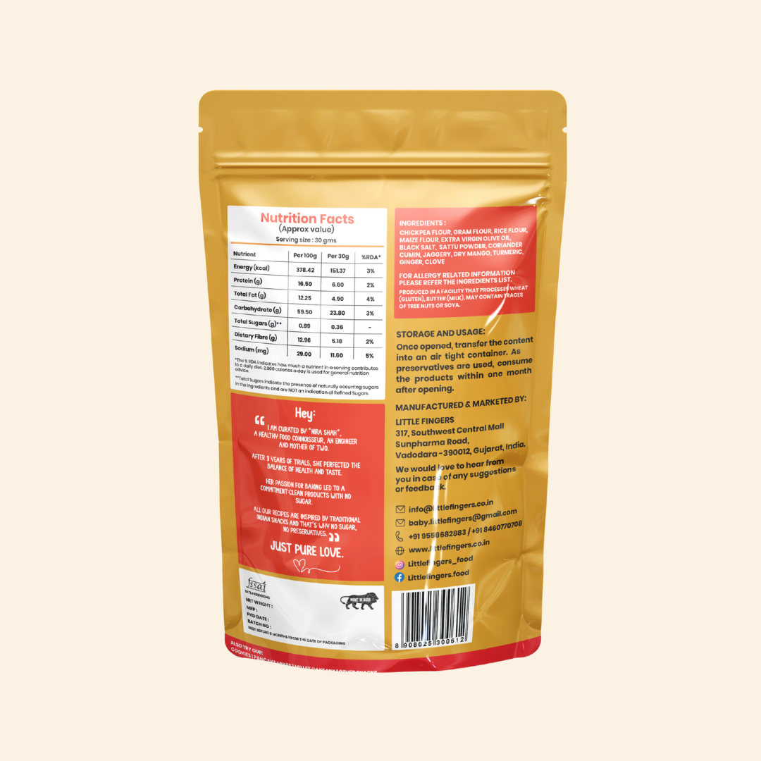 The Chickpea sticks are seasoned using traditional Indian masalas along with Sattu powder to make them more healthy! Make your little one enjoy and munch on these non spicy variant of our Chickpea Sticks! They make as a perfect introductory snack for your little one!