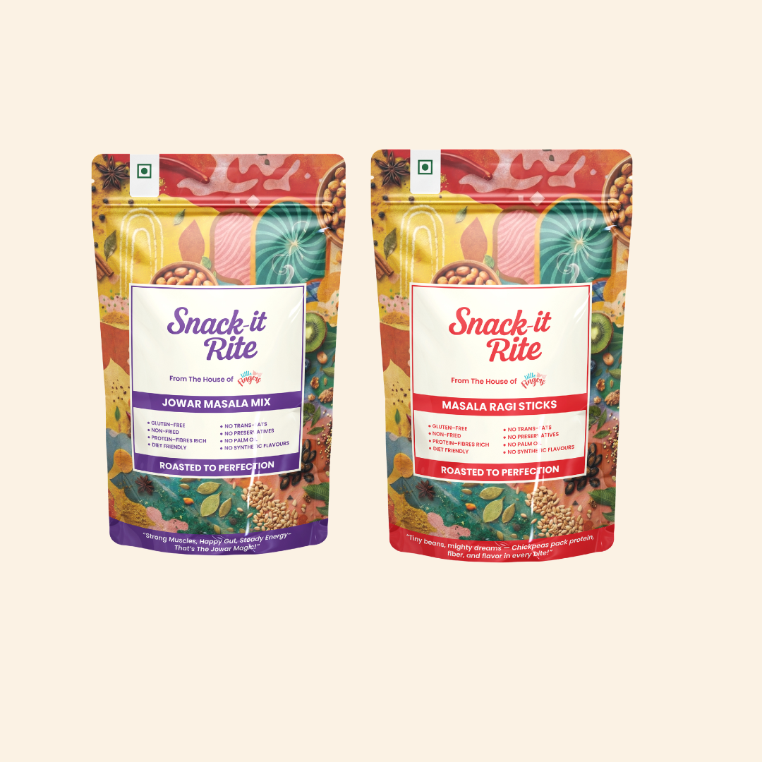 Whereas masala ragi sticks are the perfect blend of health and taste—crafted with the wholesome goodness of ragi, completely roasted and baked and seasoned with everyday indian masalas for that familiar, homely flavor.