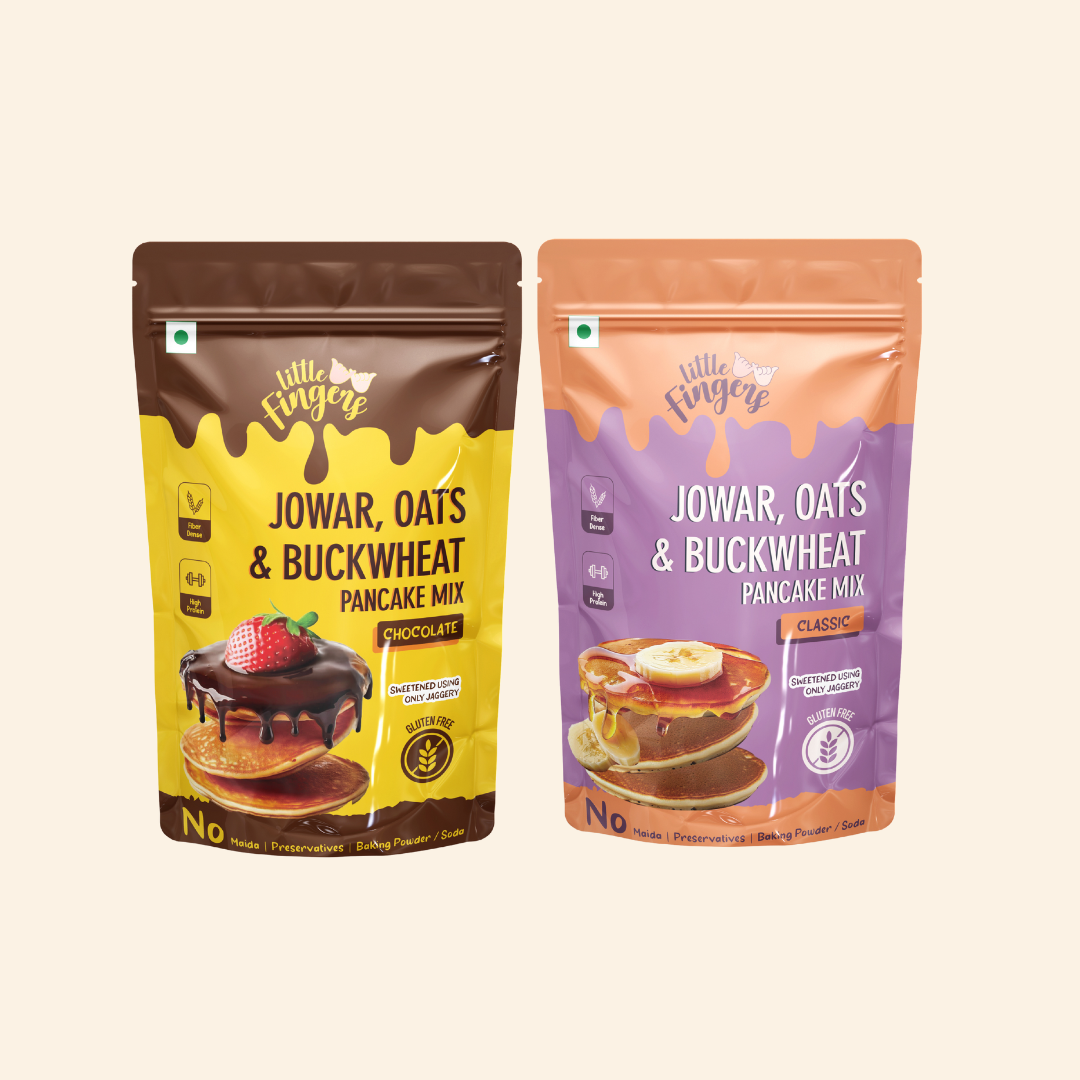 Healthy and gluten-free pancake premix made completely out of millets and oats blend and sweetened using only sulphur free jaggery.