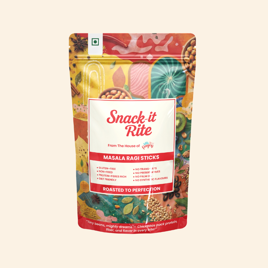 Our Masala Ragi Sticks are the perfect blend of health and taste—crafted with the wholesome goodness of ragi, completely Roasted and Baked and seasoned with everyday Indian masalas for that familiar, homely flavor. High in fiber, calcium, and iron, these crunchy sticks are a guilt-free snack made without palm oil, giving you both nutrition and satisfaction in every bite.